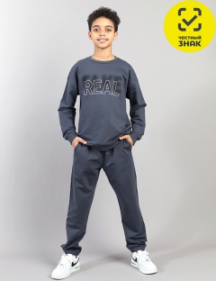 Комплект для мальчика. Джемпер свободного кроя с длинными рукавами и притачным поясом. Рукава втачные, с манжетами снизу. Воротник, манжеты и пояс изготовлены из ткани с эластаном. Передняя часть украшена принтом с эффектом «Высокая база». Брюки для мальчика изготовлены из футера без начёса. Пояс выполнен из основной ткани и снабжён эластичной резинкой внутри. Низ брюк также имеет эластичную резинку.