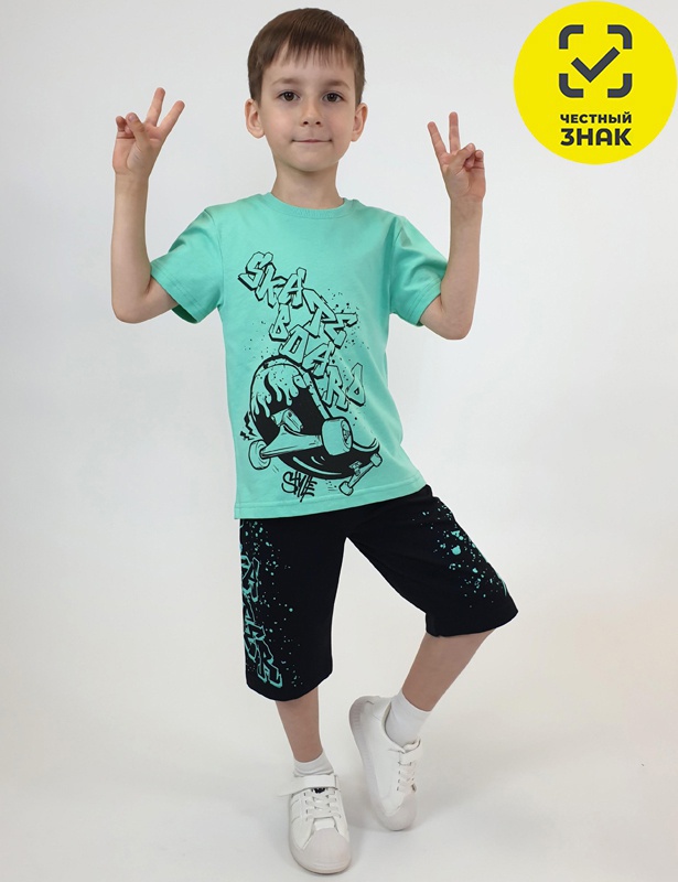 Комплект для мальчика состоит из джемпера и шорт. Прямой джемпер с коротким втачным рукавом, перед декорирован печатью. Горловина обработана ластиком. Шорты удлинённые, с притачным поясом и резинкой, без бокового шва. Шорты декорированы печатью сбоку.