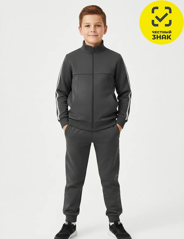 Костюм спортивный для мальчика состоит из двух предметов: куртки и брюк. Куртка с воротником стойка, застёгивается на молнию. Рукава длинные, втачные, с манжетами, декорированы контрастной вставкой. Брюки прямые, с карманами, на манжетах.