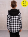 Костюм для мальчика из двухниточного футера с начесом. Рубашка с капюшоном, длинными рукавами, центральной застежкой на кнопки. Брюки по талии на резинке и кулиске, с двумя боковыми карманами, к низу зауженные на манжет, декорированы принтом.