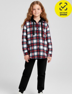 Костюм для девочки из двухниточного футера с начесом. Рубашка с капюшоном, длинными рукавами, центральной застежкой на кнопки. Брюки по талии на резинке и кулиске, с двумя боковыми карманами, к низу зауженные на манжет, декорированы принтом.