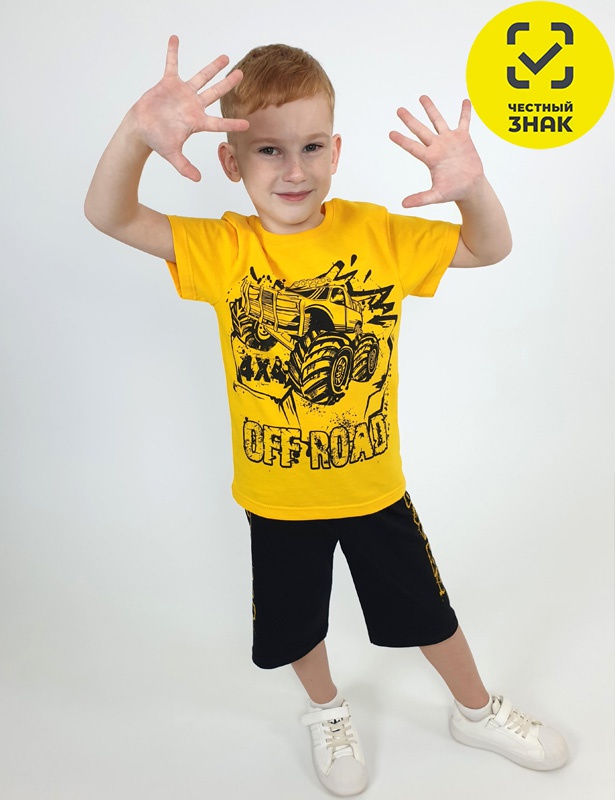 Комплект для мальчика (джемпер+шорты). Джемпер прямого кроя, короткий втачной рукав, перед с печатью. Горловина обработана ластиком. Шорты -удлиненные с притачным поясом и резинкой, без бокового шва. Печать сбоку.
