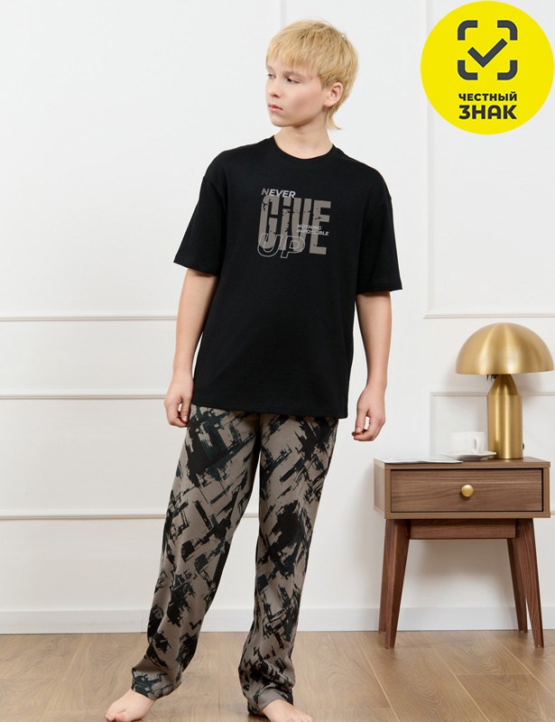 Костюм для мальчика, состоящий из футболки и брюк. Футболка однотонная с принтом на груди; модель свободная, со спущенной линией плеч, овальным вырезом горловины. Брюки из полотна с набивным рисунком эксклюзивного дизайна, прямые, с боковыми карманами с обтачными входами, на притачном поясе с отстроченной эластичной тесьмой.