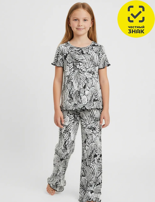 Комплект для девочки, состоит из футболки с коротким рукавом и штанов. Выполнена из мягкой хлопковой ткани с текстурой жатка.