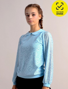 Джемпер для девочки с длинными рукавами и отложным воротником. Рукава из сетки с манжетами из кулирки. Полочка двойная - нижний слой из кулирки, верхний из сетки. Сзади застежка на пуговицу.