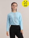 Джемпер свободного силуэта для девочки со спущенным плечом и длинными рукавами. Полочка декорированя кружевом. Воротник из основного полотна.