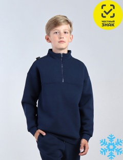 Толстовка с воротником-стойкой на "молнии". Плечевые швы переведены на полочку и отстрочены. Манжеты и пояс выполнены из рибаны с лайкрой. Декорирована текстильной этикеткой "флажок".