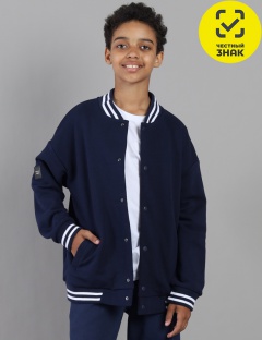 Бомбер для мальчика умеренного объема, выполнен петлевого футера трехнитки. Рукав втачной с вязаными манжетами и декоративной полоской. Застежка центральная на кнопки. Воротник и пояс вязаный с декоративной полоской. Карманы наклонные с листочкой. Рукав декорирован металлической нашивкой.