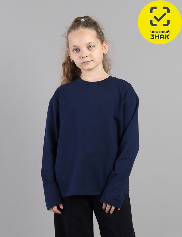 жемпер свободного силуэта для девочки со спущенным плечом и длинными рукавами. Воротник из основного полотна. На спинке декоративная жаккардовая этикетка.
