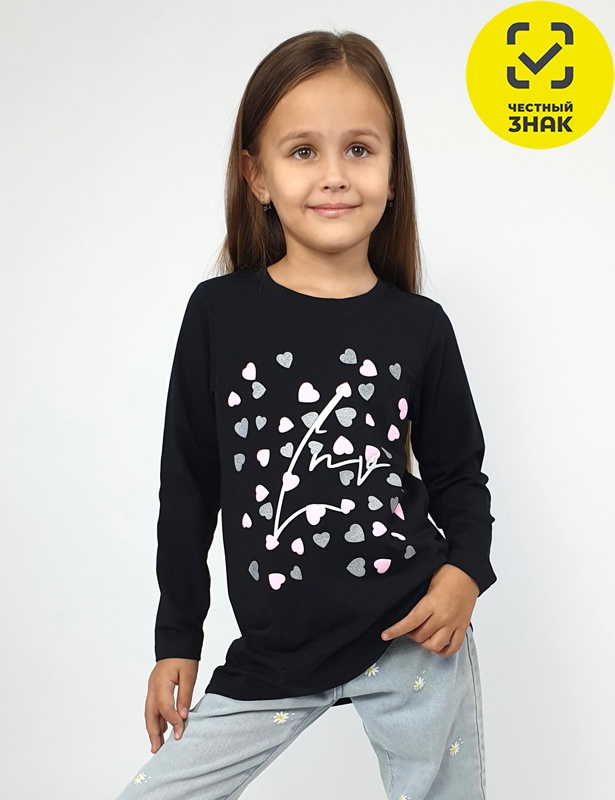 Джемпер для девочки - силуэт трапеция, перед с печатью. Рукав втачной, длинный. Горловина обработана планкой, низ изделия и рукава подшиты.