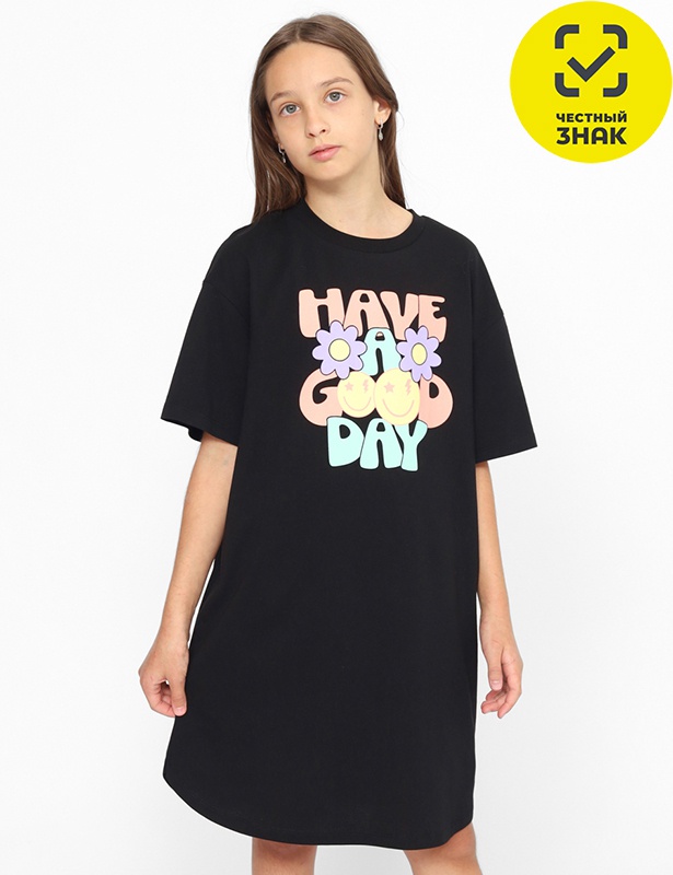 Ночная сорочка, домашнее платье, туника для девочки оверсайз с коротким рукавом, средней длины и свободного кроя, подходит к фигуре любого типа. Стильная, модная, туника для девочки-подростка выполнена из 100% органического хлопка. Легкая и дышащая текстура материала подарит комфортные ощущения. Перед декорирован трендовым принтом (надпись: Хорошего дня).