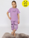 Гладкокрашенная пижама из футболки и бридж. Футболка свободного покроя с коротким рукавом. Горловина обработана притачной бейкой из рибаны с лайкрой. Перед оформлен принтом. Бриджи прямые умеренного объёма длиной ниже колена. Цельнокроенный пояс обработан плоским швом вподгибку с одновременным прокладыванием резинки. На левой стороне выполнен принт.