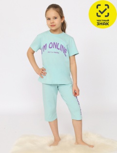 Гладкокрашенная пижама из футболки и бридж. Футболка свободного покроя с коротким рукавом. Горловина обработана притачной бейкой из рибаны с лайкрой. Перед оформлен принтом. Бриджи прямые умеренного объёма длиной ниже колена. Цельнокроенный пояс обработан плоским швом вподгибку с одновременным прокладыванием резинки. На левой стороне выполнен принт.