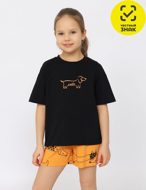 Пижама гладкокрашенная из футболки и шорт. Футболка оверсайз с коротким рукавом. Горловина обработана притачной бейкой из рибаны с лайкрой. Перед оформлен принтом. Шорты свободного покроя длиной до середины бедра. Цельнокроенный пояс обработан плоским швом вподгибку с одновременным прокладыванием резинки.
