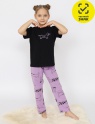 Комбинированная пижама из футболки и брюк. Футболка гладкокрашенная, свободного покроя с коротким рукавом. Горловина обработана притачной бейкой из рибаны с лайкрой. Перед оформлен небольшим принтом. Прямые брюки умеренного объёма выполнены из набивного полотна дополнительного цвета. Цельнокроенный пояс обработан плоским швом вподгибку с одновременным прокладыванием резинки.
