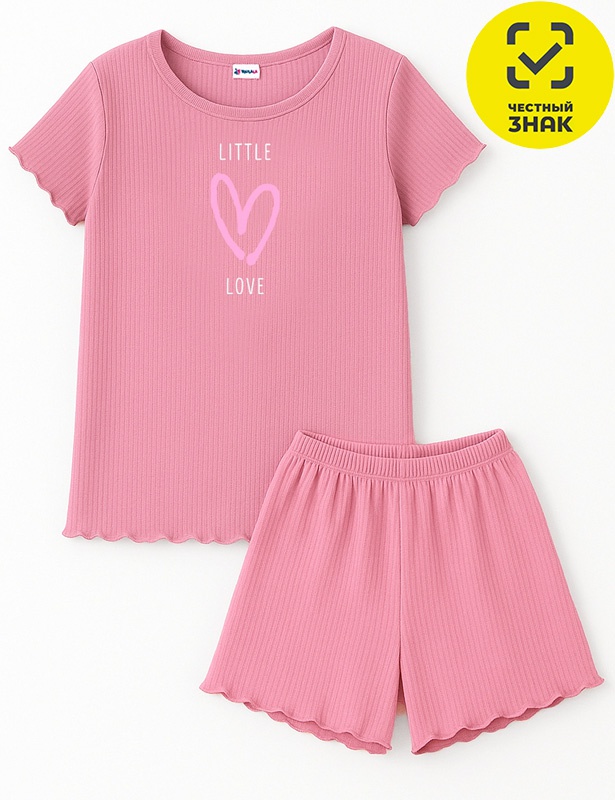 Пижамный комплект для девочки, состоит из футболки и шорт, изготовлена из хлопкового однотонного полотна «лапша». Футболка прямого кроя с короткими рукавами и округлым вырезом горловины, рукава и низ окантованы спиральным швом, на полочке принт. Шорты свободного кроя с эластичной резинкой на поясе, низ окантован спиральным швом.
