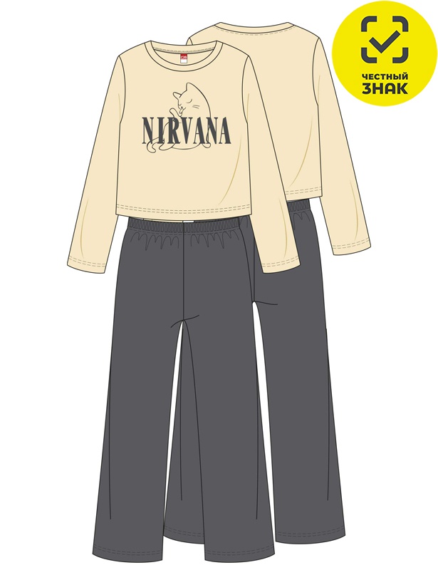 Пижама для девочки: джемпер и брюки из мягкого трикотажа с выстваом иглы. Джемпер с длинным рукавом. Горловина круглая, из рибаны.На полочке выполнена шелкография в виде кошечки и надпись - нирвана. Брюки с поясом на резинке.