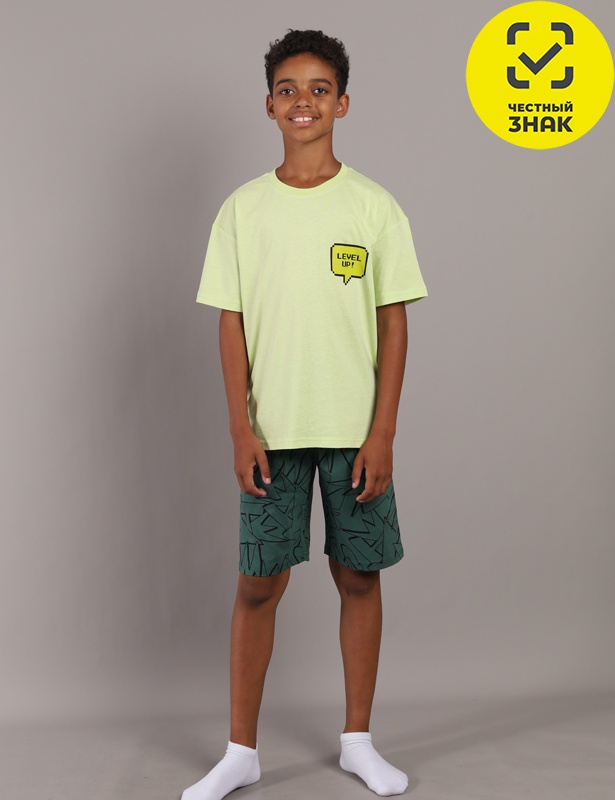 Пижама для мальчика: футболка и шорты из мягкого трикотажа. Футболка с коротким рукавом. Горловина круглая, из рибаны. На полочке выполнена шелкография. Шорты с поясом на резинке.