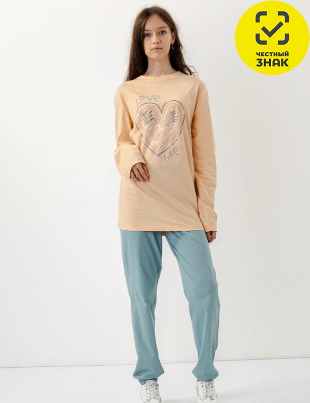Пижама для девочки: джемпер и брюки из мягкого трикотажа. Джемпер с длинным рукавом на манжете из кашкорсе. Горловина круглая, из кашкорсе. На полочке выполнена шелкография в сердца и надпись - "люби меня". Брюки с поясом на резинке и манжетами по низу из кашкорсе.