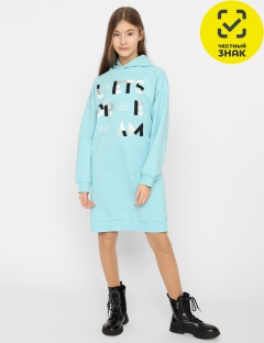 Платье для девочки с длинными рукавами и капюшоном. Рукава с манжетами по низу. Нижние срезы платья обработаны притачным поясом. Пояс и манжеты выполнены из полотна с эластаном. Перед платья декорирован принтом "Давай мечтать".