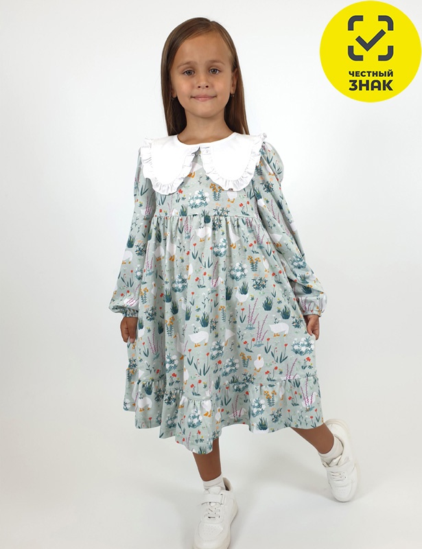 Платье имеет отрезную юбку, собранную по низу. Длинный втачной рукав тоже собран по окату и снизу закреплён резинкой. Горловина платья окантована и подшита. Воротник отделочный,съемный. Застёгивается платье на пуговицы по спинке.