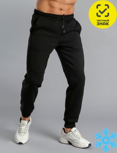 Брюки мужские из футера трехнитки с начесом, немного зауженные к низу на манжетах, на поясе на эластичной резинке с кулиской и продетым в нее функциональным шнуром, карманы по бокам.