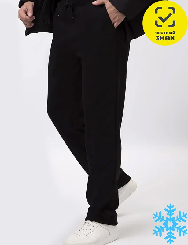 Мужские утепленные брюки из футера 3-х нитки, прямого кроя, с боковыми карманами и эластичным поясом.