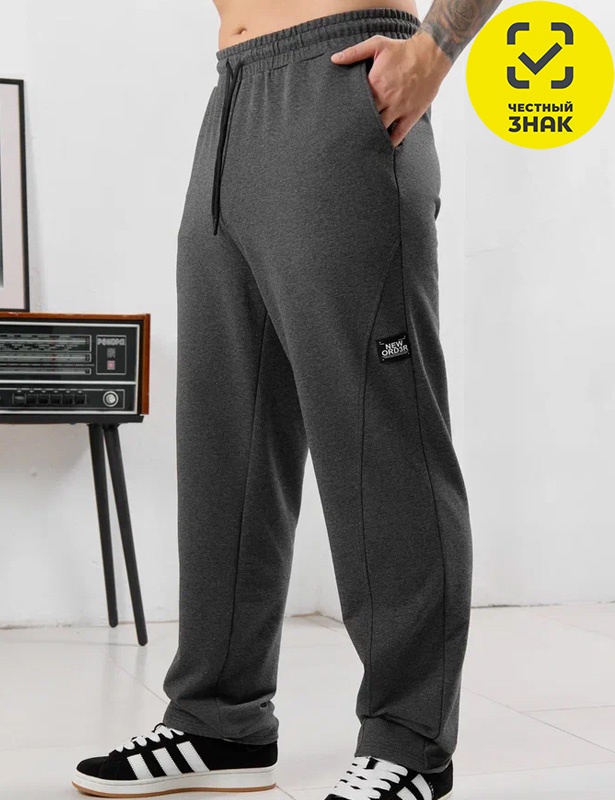 Брюки мужские прямого силуэта, из трикотажного полотна «футер двунитка с лайкрой». Модель с рельефными швами по передним деталям, декоративной «нашивкой», с карманами в боковых швах, на притачном поясе с отстроченной эластичной тесьмой и шнуром для регулирования степени прилегания изделия по линии талии, продетым через две обметанные петли в центре пояса.