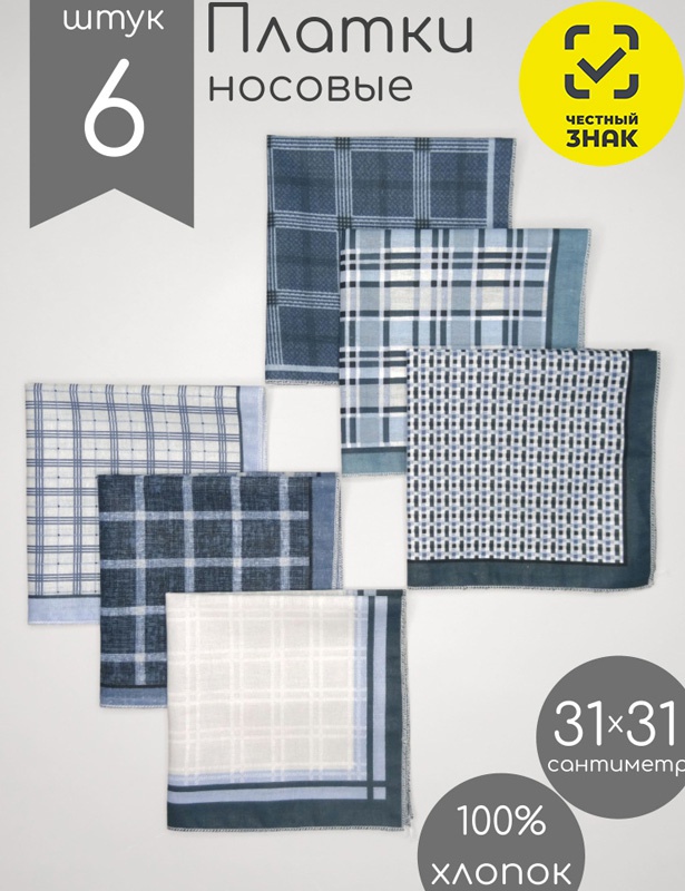 Платок носовой размером 31*31 см. Цена за упаковку, продажа по оптовым ценам осуществляется упаковками, 6 шт в упаковке.
