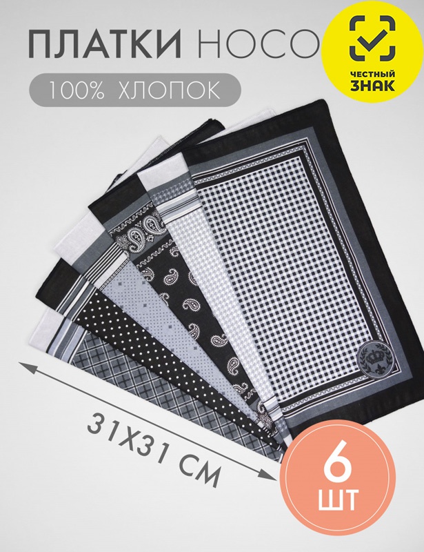Платок носовой размером 31*31 см. Цена за упаковку, продажа по оптовым ценам осуществляется упаковками, 6 шт в упаковке.