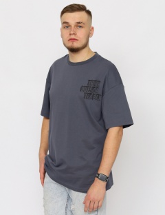 Футболка оверсайз длиной по линию бедер. Рукав до локтя. Круглая горловина обработана узкой притачной обтачкой из рибаны с эластаном. Полочка декорирована принтом.