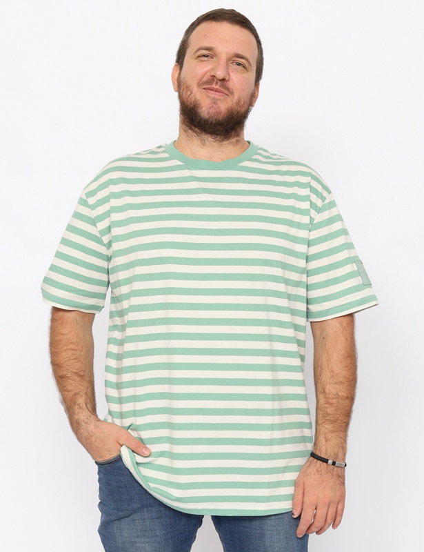 Футболка прямого силуэта длиной по линию бедер из полосатого полотна. Короткий рукав. Круглая горловина обработана узкой притачной обтачкой из рибаны с эластаном. Рукав декорирован жаккардовой нашивкой "сдерживайте сильные ветры".