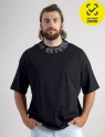 Объемная футболка оверсайз из кулирки повышенной плотности длиной до бедер. Рукав до локтя. Круглая горловина обработана узкой притачной обтачкой из рибаны с эластаном. Горловина декорирована принтом "возврата нет".