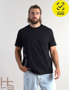 Футболка oversize со спущенным плечом, с коротким рукавом. Горловина круглая, обработана притачной бейкой из рибаны с лакрой. Плечевые швы смещены на перед и отстрочены. По переду вдоль правого бокового шва - текстовый принт.