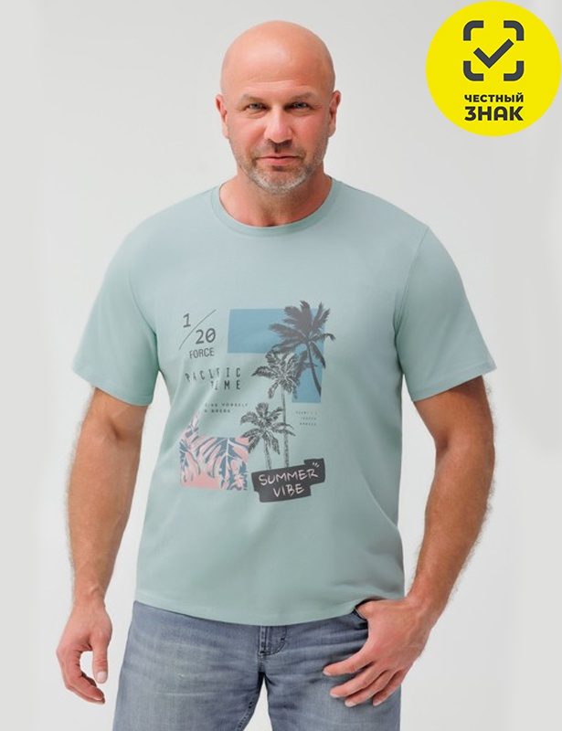 Футболка мужская из кулирного полотна, короткий втачной рукав и округлая горловина. Полочка декорирована печатью.
