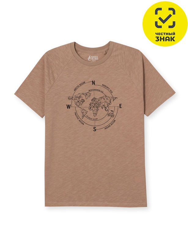 Футболка из полотна ФЛАМ ЭФФЕКТ (неравномерная пряжа) среднего объема с коротким рукавом реглан. На полочке принт "КАРТА ОКЕАНОВ" По горловине притачная обтачка из рибаны с эластаном. Шов по горловине спинки закрыт экстрафорной лентой.
