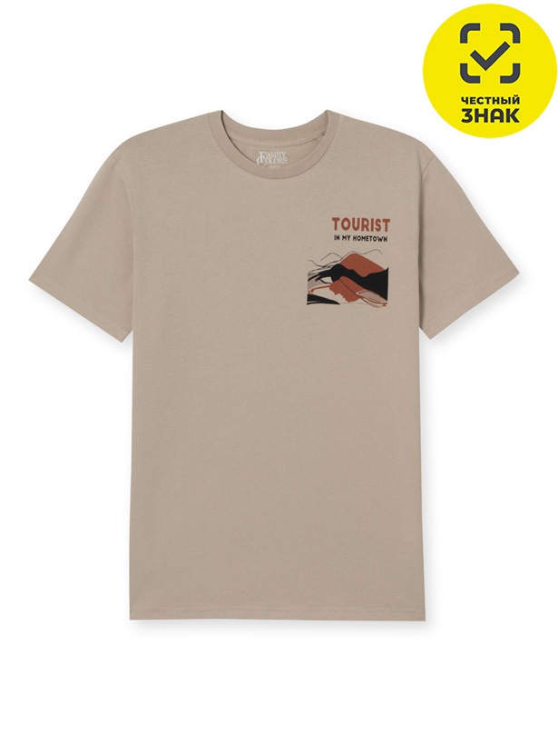 Футболка классического объема с коротким рукавом. По горловине притачная обтачка из рибаны с эластаном. На груди с левой стороны небольшой принт "ТУРИСТ в моем городе". Шов по горловине спинки закрыт экстрафорной лентой. В боковых швах разрезы.