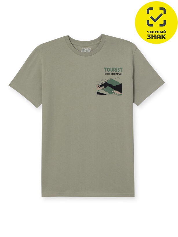 Футболка классического объема с коротким рукавом. По горловине притачная обтачка из рибаны с эластаном. На груди с левой стороны небольшой принт "ТУРИСТ в моем городе". Шов по горловине спинки закрыт экстрафорной лентой. В боковых швах разрезы.