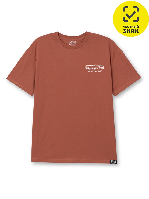Футболка классического объема с коротким рукавом. Горловина обработана притачной обтачкой из рибаны с эластаном. На полочке с левой стороны небольшой принт "ИДИ ТУДА, ГДЕ ЧУВСТВУЕШЬ СЕБЯ НАИБОЛЕЕ ЖИВЫМ", внизу нашивная декоартивная этикетка-клипса "ПОЧУВСТВУЙ СЕБЯ ЖИВЫМ" . Шов по горловине спинки закрыт экстрафорной лентой.