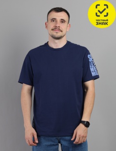 Свободная футболка прямого силуэта длиной до бедер. Короткий рукав. Круглая горловина обработана узкой притачной обтачкой из рибаны с эластаном. Полочка декорирована текстильной нашивкой, на рукаве принт.
