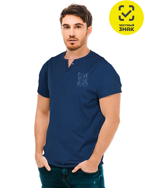 Футболка из трикотажной хлопчатобумажной ткани, с коротким рукавом. Темные полотна мягко контрастируют с небольшим принтом в виде надписи. Округлая форма горловины с треугольным вырезом создаст непревзойденный стильный образ.