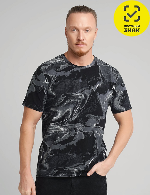 Футболка мужская из хлопкового полотна, c круглым вырезом горловины и коротким втачным рукавом.