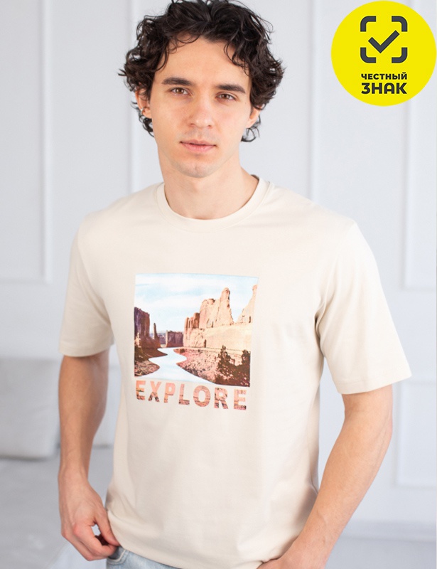 Мужская футболка выполнена в классическом стиле: прямой крой, короткие рукава и круглый вырез горловины. Особенностью модели является принт, который украшает переднюю часть изделия.