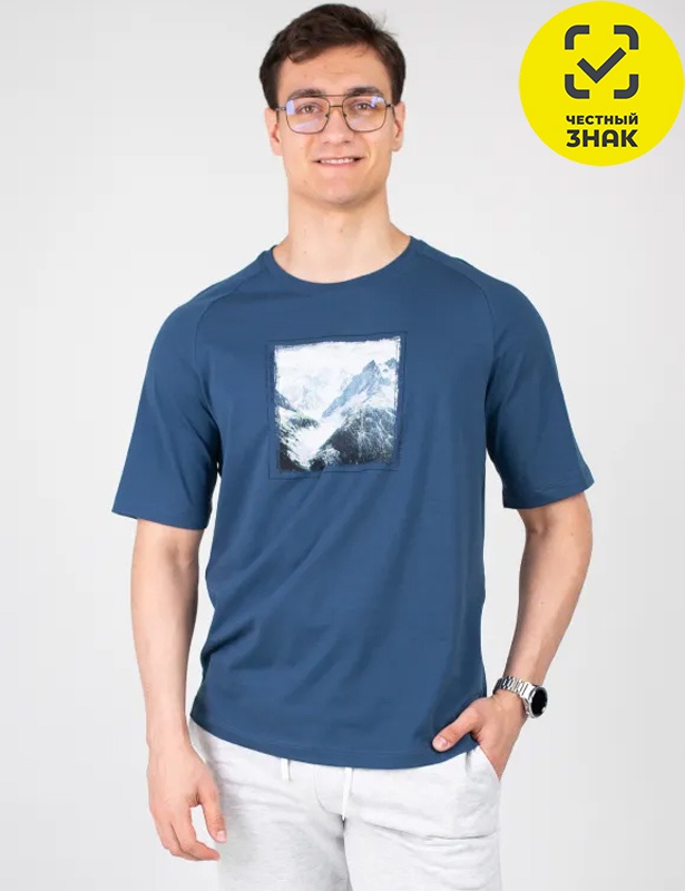 Мужская футболка выполнена в классическом стиле: прямой крой, короткие рукава и круглый вырез горловины. Особенностью модели является принт, который украшает переднюю часть изделия.