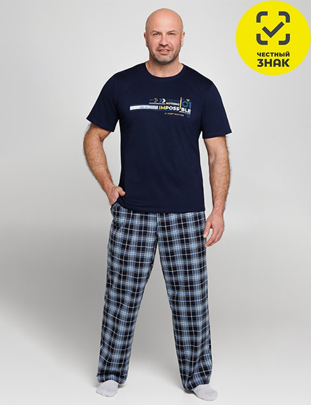 Пижама мужская состоит из 2-х предметов. Футболка с коротким втачным рукавом, округлый вырез горловины, на полочке печать. Брюки прямые из набивного полотна с рисунком "в клетку", на поясе на резинке, по бокам карманы.