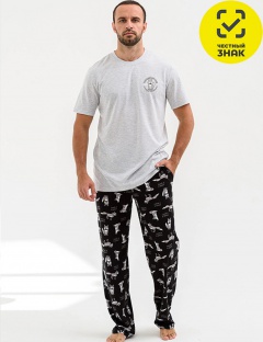 Мужская пижама состоит из футболки и брюк. Футболка с коротким рукавом и округлой горловиной, спереди расположен принт. Брюки изготовлены из набивного полотна, на поясе есть резинка, по бокам карманы.