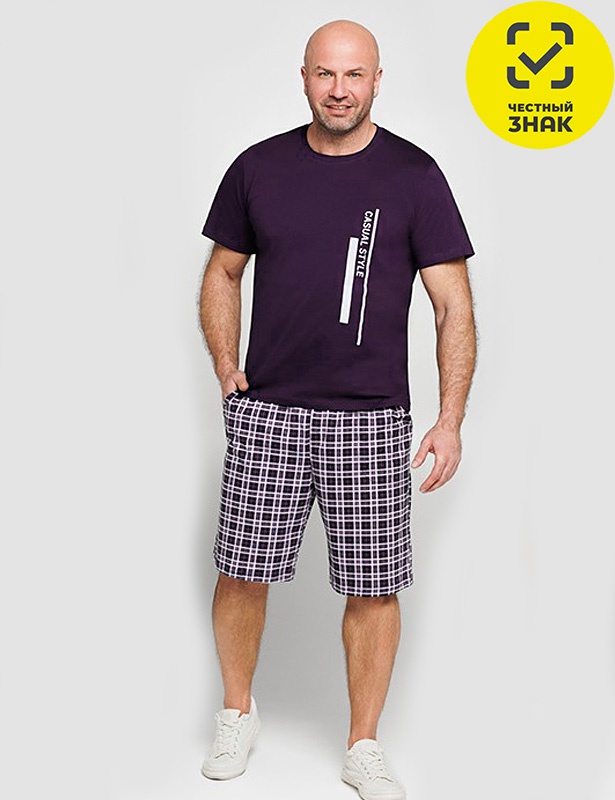 Комплект мужской состоит из 2-х предметов. Футболка с коротким втачным рукавом, округлой горловиной, на полочке печать. Шорты из набивного полотна, на поясе на резинке, прямые, длиной до колена.