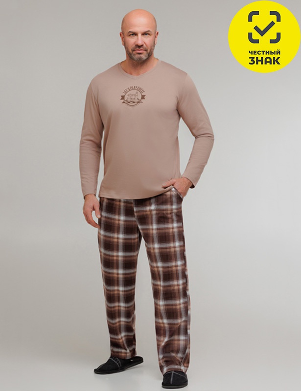 Пижама мужская состоит из 2-х предметов. Джемпер с длинными втачными рукавами, округлой горловиной, печать спереди. Брюки прямые, на поясе на резинке, карманы по бокам.