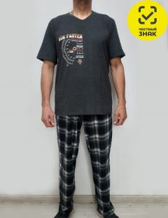 Пижама мужская состоит из 2-х предметов. Джемпер с длинными втачными рукавами, округлой горловиной, печать спереди. Брюки прямые, на поясе на резинке, карманы по бокам.