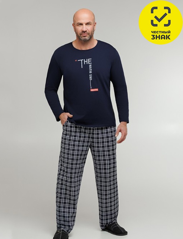 Комплект мужской состоит из 2-х предметов. Джемпер с длинными втачными рукавами, округлой горловиной, печать спереди. Брюки прямые, на поясе на резинке, карманы по бокам.